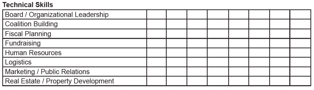 The second section of our form focused on the individuals skills. We list skills that are important for the organization to have. This doesn’t mean that Board Member A is going to be responsible for that particular task. Often, that will still fall to the Executive Director. However, having someone on the board with that skill set gives the director someone who can be a mentor or lend assistance/guidance on a particular issue. They will also be helpful when issues in their wheelhouse come before the board.